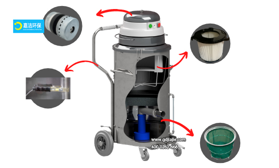 工業(yè)吸塵器通過渦輪風機、文丘裏管等設(shè)備將(jiāng)桶身(shēn)內部抽成真空,使其負壓快速升高,高負壓使空氣迅速通過(guò)進風口流入桶身內部,通過吸塵刷及吸(xī)塵管,流動(dòng)的空氣攜帶(dài)需要收集和處理的固體顆粒物進入桶身。