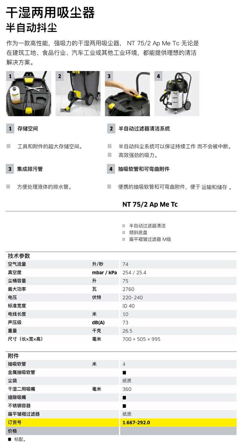 NT 75/2 Ap Me Tc 還設有監測係統以確保濕塵的量不要超過限量。通過耐油排水管,液體可(kě)以容易地被掏空。配件可以快速(sù)連接到吸塵器並方便使用。設備自帶的超(chāo)大(dà)儲物箱(xiāng)可用於(yú)存放工具和附件。兩個輪子和兩個滾輪給NT 75/2 Ap Me Tc良好的移動性。