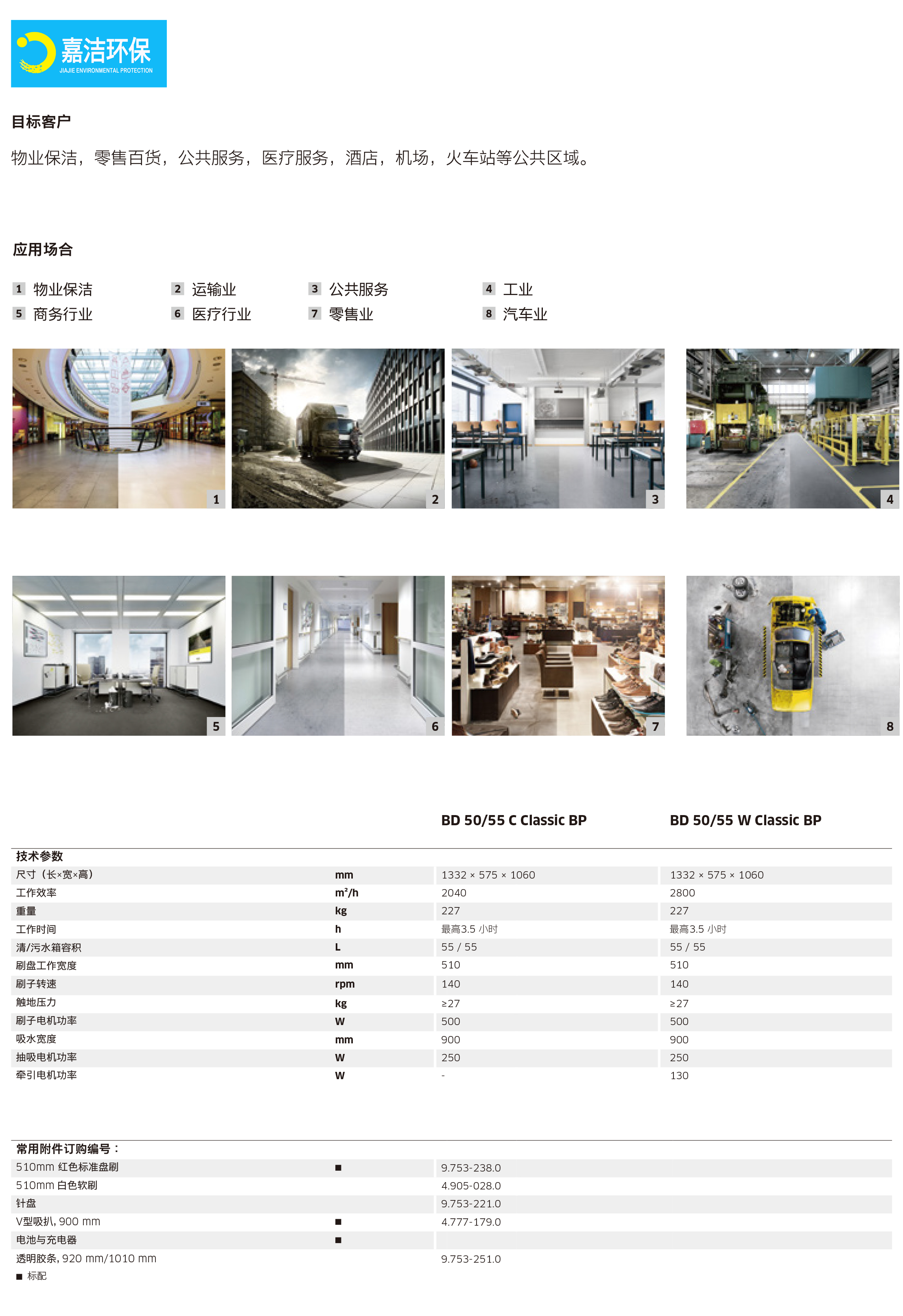 卡赫手推式洗地吸幹機BD 50/55 W Classic適用範圍廣泛,可用於商場超市,生鮮菜場,物業保潔(jié),醫療、辦公樓宇,工廠及展(zhǎn)館等公共場所的清潔,還可以通過(guò)選用不同材質的附件(jiàn),滿足多種清潔作業區域,如(rú):水泥、花崗岩、大理石、陶瓷、石板等硬質地麵和弱性地板。